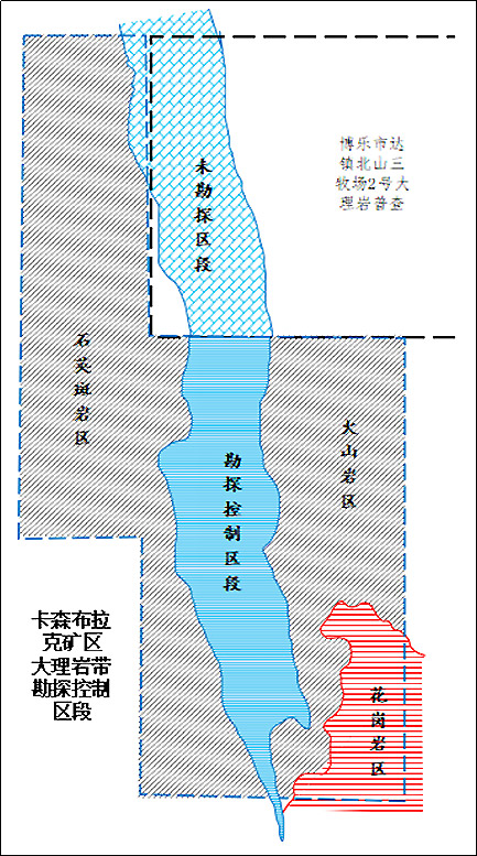 勘探控制到矿区大理岩带南段2100m长度,其北段1400m长度大理岩带暂未进行地质矿产勘探工作。