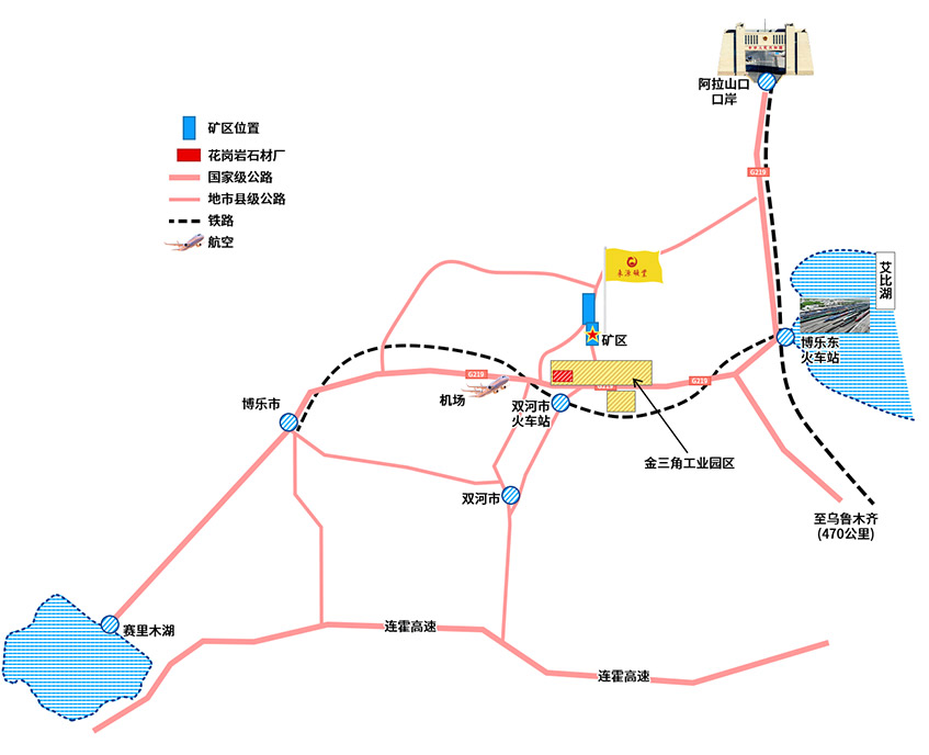 矿区交通网络纵横交错、畅达八方。距双河火车站 10 公里,博乐机场 18 公里,与连霍高速相距 50 公里,同 G219 国道 4 公里,阿拉山口口岸40公里,犹如无形纽带紧密连接着国内外市场,构建起“矿仓即口岸”的跨境贸易生态。